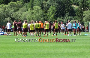 Quarta giornata di lavoro a Pinzolo per la Roma di Rudi Garcia che anche oggi è stata sottoposta ad una doppia seduta. La squadra giallorossa, dopo un veloce quanto intenso lavoro in palestra, è scesa in campo alle 10:30 agli ordini del preparatore atletico Darcy Norman. Come programmato già nella seduta di martedì, il gruppo si è concentrato sul lavoro di potenziamento ed esplosività. Sono di nuovo stati utilizzati gli elastici, indicati per esercizi specifici quanto per la mobilità articolare. Grande attenzione riservata allo stretching, alternato ad ogni fase di carico e al lavoro a corpo libero: squot e affondi ne fanno da padrone, sostituendo le macchine da sala pesi. Il gruppo è stato poi diviso in due per un’esercitazione alternata tra rafforzamento parte superiore ed inferiore. I primi alle prese con la palla medica, focalizzandosi su parete addominale e braccia. I secondi con un lavoro sull’esplosività con semisquot jump, doppi e monolaterali, atti a migliorare la velocità sui primi passi. Nella seconda parte della seduta, la squadra, ancora divisa in due blocchi, si è alternata in esercizi di slancio, tenute e navette con traino (pesi di 20 kg). A differenza di quanto accaduto nel secondo giorno di ritiro, lo staff di preparatori ha aggiunto un lavoro aerobico sulla corsa sulla distanza di 1500m, tenendo presente i tempi. In evidenza in positivo Iago Falque, Gervinho, Strootman (costante nel passo senza mai perdere ritmo), mentre in negativo da segnalare il pesante affaticamento di Maicon e Cole, stremati al tappeto al termine del percorso. Totti, sulla soglia dei 39, ancora in discreta forma. Florenzi non ha preso parte a quest’ultima fase per dedicarsi piuttosto ad una corsa leggera di circa mezzora. Ancora una volta è emerso il carisma di Norman, che oltre al controllo quasi maniacale dello svolgimento degli esercizi, ha racchiuso in circolo il gruppo per complimentarsi ed applaudire ogni singolo interprete e chiudendo con un pesante “Forza Roma”. Prima di porre fine all’allenamento, scarico muscolare con 8 allunghi sui 70 metri per convertire il carico.