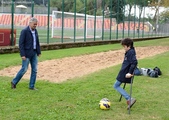 Un sogno che si realizza, un’iniziativa di grande sensibilità per la Roma. In mattinata la società giallorossa ha ospitato all’interno del centro sportivo “Fulvio Bernardini” Francesco Messori, ragazzo nato con la sola gamba sinistra, che sin da bambino gioca a pallone con i ragazzi normodotati. Francesco ha assistito all’allenamento di rifinitura dei giallorossi e, al termine della seduta, tutti i calciatori si sono fermati per conoscerlo e farsi fotografare con lui (vedi le foto sul profilo ufficiale Facebook della Roma). Presenti anche tutti i dirigenti, Claudio FenucciWalter Sabatini Franco Baldini. Il direttore generale è stato ritratto anche in uno scambio di passaggi con il ragazzo. All’uscita dagli spogliatoi Messori ha avuto anche l’opportunità di conoscere il capitano Francesco Totti e i due sono stati fotografati in una sala interna di Trigoria. Domani sera il ragazzo entrerà in campo al fianco del numero dieci giallorosso prima dell’inizio della partita.