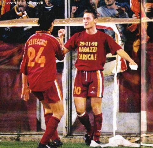 Era il 29 novembre 1998. La Roma allenata da Zdenek Zeman era chiamata a sfatare il tabù derby: nel campionato precedente infatti i giallorossi di stracittadine, tra campionato e Coppa Italia, ne avevano perse ben quattro. Una vera e propria maledizione che in qualche modo andava interrotta. I tifosi chiedevano una prova di carattere e la chiedeva anche il tecnico boemo. E che la Roma abbia voglia di rifarsi lo si capisce dai primi minuti, quando al 25′ del primo tempo Delvecchio, su lancio di Wome, porta in vantaggio la Roma. Quel gol sembra spianare la strada alla Roma, ma i giallorossi devono fare i conti con la classe di Roberto Mancini, che, a pochi minuti dalla fine del primo tempo, sigla il gol del pareggio biancoceleste. Alla ripresa le cose si mettono ancora peggio: la Lazio prima raddoppia ancora con Mancini, poi dal dischetto Salas sigla il terzo gol. La Roma, in dieci per l’espulsione di Petruzzi, sembra ormai spacciata. Ma ad un qurto d’ora dalla fine succede qualcosa che ha dell’incredibile: la Roma prima accorcia le distanze con Di Francesco, poi sigla il gol del pari con la prima rete nel derby di Francesco Totti. La Curva Sud esplode, l’Olimpico è una bolgia. E non contenti del pari, i ragazzi di Zeman vanno anche alla ricerca del quarto gol, che trovano con Marco Delvecchio: l’arbitro Farina però annulla per un fuorigioco inesistente. Ma non fa niente, basta il pari. A fine partita è festa giallorossa!