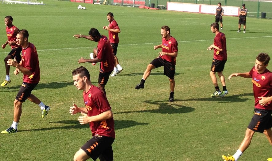 A Trigoria, questa mattina, ultimo allenamento in vista della sfida casalinga contro il Palermo di Gasperini. Per i ragazzi di mister Zeman lavoro sulla circolazione del pallone e sulle fase difensiva. Assenti De Rossi, Stekelenburg e Lobont; regolarmente in campo Castan ed Osvaldo. Prima della seduta, il ds giallorosso Walter Sabatini si è intrattenuto a colloquio con la squadra.