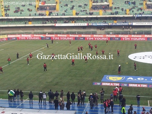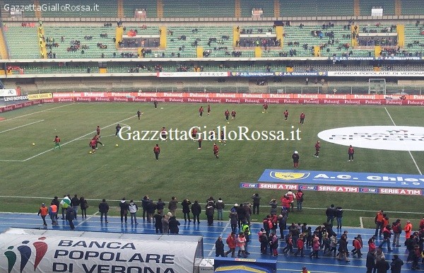 Alle ore 14.20 la Roma è scesa sul terreno del Bentegodi per il consueto riscaldamento pre gara. Cielo sereno e temperatura vicina agli 0° e campo in buone condizioni. Sugli spalti per ora presenti un centinaio di tifosi giallorossi.