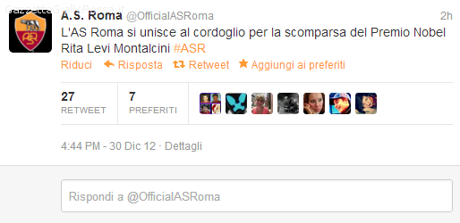 Tramite il proprio profilo Twitter, la Roma ha espresso il proprio cordoglio per la scomparsa del Premio Nobel Rita Levi Montalcini, venuta a mancare nella giornata di oggi all'età di 103 anni: "L'AS Roma si unisce al cordoglio per la scomparsa del Premio Nobel Rita Levi Montalcini".