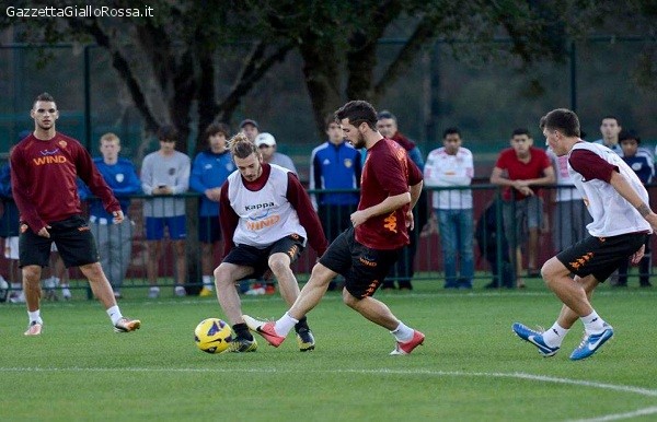 Inizia la partitella con i giocatori divisi in due gruppi. La gara è a ritmi molto elevati  e termina con il risultato di 3-1 per i bianchi. In grande evidenza Francesco Totti autore di uno splendido gol. A segno anche Pjanic, Bradley e Florenzi.