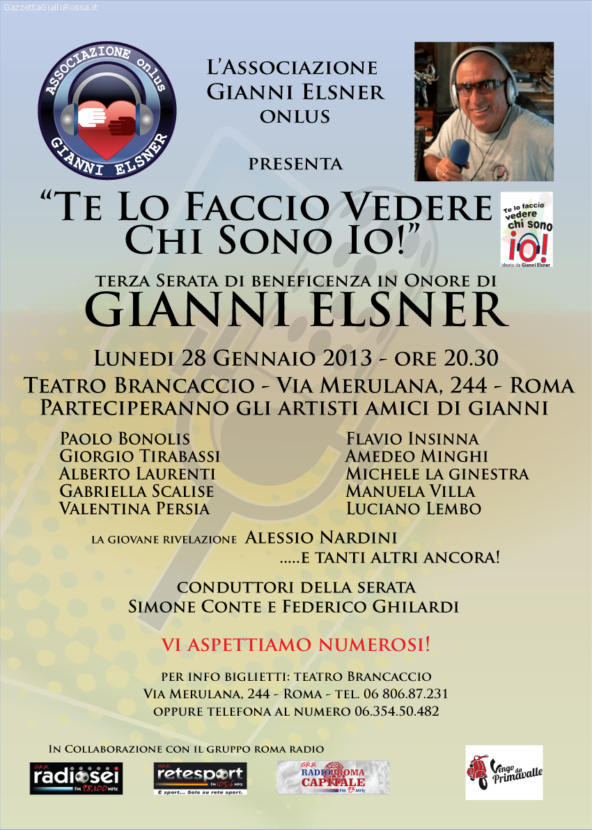 Lunedì 28 gennaio 2013, dalle 20,30, presso il Teatro Brancaccio di Roma via Merulana, 244, si terrà la terza serata in onore di Gianni Elsner, dal titolo “Te lo faccio vedere chi sono io”. Tanti artisti – amici di Gianni, si alterneranno sul palco in una gara di beneficenza e solidarietà: Paolo Bonolis, Flavio Insinna, Giorgio Tirabassi, Amedeo Minghi, Michele La Ginestra, Alberto Laurenti, Valentina Persia, Gabriella Scalise e tanti altri ancora. Una serata in allegria per rendergli omaggio e per raccogliere fondi a favore dell’associazione fondata in suo onore nell’ottobre del 2009, quando prematuramente è scomparso. Un evento che racchiuderà in sé alcune grandi passioni di Gianni, ovvero il teatro e la solidarietà.