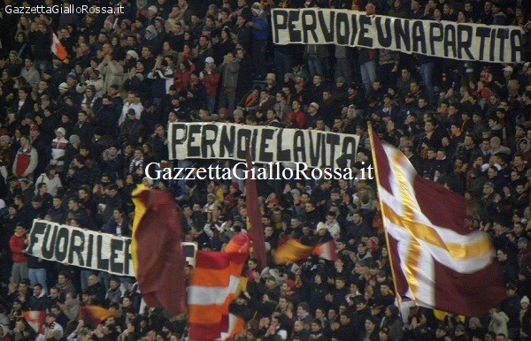 ROMA-INTER Esposto striscione in Curva Sud (FOTO) Archivio PRIMO PIANO by - 23 Gennaio 2013 Prima dell’inizio della gara contro l’Inter in Curva Sud è stato esposto uno striscione dai tifosi giallorossi. PER VOI E’ UNA PARTITA PER NOI E’ LA VITA FUORI LE PALLE! Striscione Curva Sud