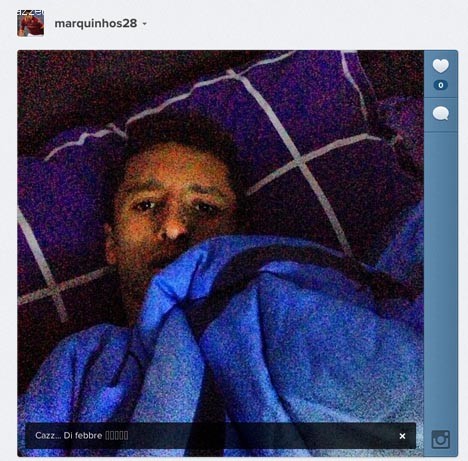 Assente all’allenamento odierno, Marquinhos utilizza il proprio profilo di un famoso social network sempre più in voga tra i calciatori, per far sapere a tutti quali siano le sue reali condizioni di salute attraverso un messaggio che lascia poco spazio all’interpretazione, aggiungendo anche una foto sotto le coperte. Questo il contenuto delle sue eloquenti esternazioni: