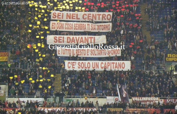 GAZZETTA GIALLOROSSA In Tribuna Tevere strisicone per Francesco Totti (FOTO) PRIMO PIANO by - 8 Aprile 2013 Prima dell’inizio della gara contro la Lazio in Tribuna Tevere esposto uno striscione per il capitano Francesco Totti Striscione esposto in Tribuna Tevere