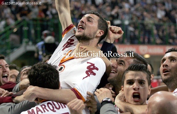 Che strano andamento hanno le lancette della nostra emotività: inizia ed è interminabile il tempo che hai davanti, poi Jonathan va in goal e sembra che girino all’impazzata. Vai al riposo sotto una mole di malinconia che ce ne vuole a rammentarne altrettanta (nonostante la storia della Roma), confidando in chissà cosa, fosse anche un ingresso di Perrotta. Ma fa più giri una lancetta o una sfera? Dipende dalla carezza. Carezza? Perché cos’altro è il pareggio di Destro? Un pareggio di destro, inteso come piede, ma come fosse la piuma di Forrest Gump, per il giro che prende dopo il suggerimento di Lamela: l’esperanto dei piedi buoni, la lingua universale che però è parlata solo da un’élite. È ciò che inchioda l’orologio di una partita che fino a quel momento aveva fatto scomodare gli aggettivi più brutti e più bruti, se possibile, indirizzati verso una squadra che in maniera imbarazzante stava dilapidando una stagione contro una compagine, se possibile, ancora più imbarazzante. Era in vantaggio un’Inter litigiosa con se stessa (Schelotto), goffa nelle azioni più semplici (Juan Jesus), disperata nel tentativo di premere il grilletto per le ultime cartucce (Rocchi). Poi, appunto, la sfera gira. Per una volta dalla parte giusta. Lì le cose ridiventano normali, proporzionati i valori in campo, grigia l’espressione dei Moratti, come gli occhi di Beppe Baresi che fissano il vuoto, accanto a Stramaccioni che tenta di indovinare la traiettoria dello sguardo. Invece la indovina Torosidis, che fa spiovere il suo uno a tre alle spalle del migliore interista, Handanovic, quello che aveva dato fosforo ai nostri spettri. Dicono che poi abbia segnato anche Alvarez e che nell’Inter abbia esordito Belloni pettinato da Justin Bieber. Consultate i tabellini per sapere se è vero.