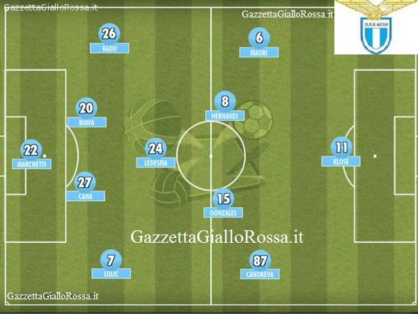 LAZIO (4-1-4-1): 22 Marchetti; 27 Cana, 20 Biava, 26 Radu,19 Lulic; 24 Ledesma; 87 Candreva, 8 Hernanes, 15 Gonzalez, 6 Mauri; 11 Klose. A disp. 1 Bizzarri, 95 Strakosha, 7 Ederson,23 Onazi,28 Saha 25 Rozzi, 18 Kozak. All. Petkovic