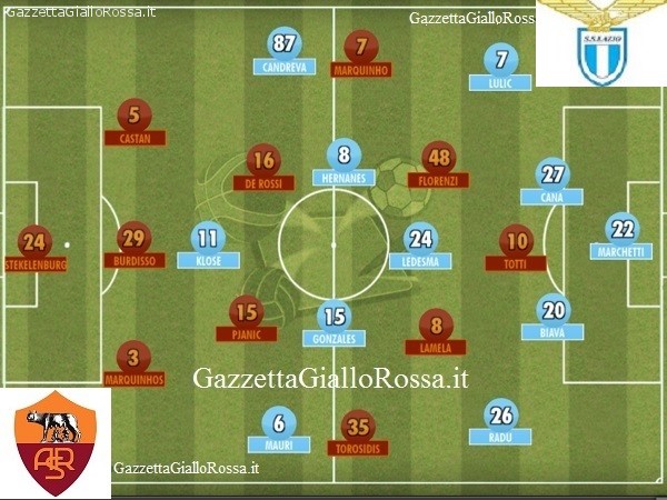 A difendere i pali della squadra capitolina, presente Maarten Stekelenburg. Il terzetto difensivo si avvarrà di Burdisso in qualità di centrale, il quale ha denotato una condizione non brillantissima nelle recenti uscite, e potrà senz’altro trarre giovamento dall’affiancamento di Castan e Marquinhos. In particolar modo la tempestività nelle chiusure di quest’ultimo renderà più agevole il compito dell’argentino che se la dovrà vedere con Klose. A centrocampo con il ritorno di Pjanic al fianco di De Rossi, Andreazzoli può schierare la miglior integrazione a sua disposizione, unendo l’interdizione del numero 16 giallorosso alle geometrie del bosniaco. Sulle fasce Torosidis tornerà titolare a destra mentre a sinistra il probabile forfait di Balzaretti indurrà alla scelta di un altalenante Marquinho, elemento di spiccata vocazione offensiva che dovrà sacrificarsi molto in fase di copertura. Anche il brasiliano ha evidenziato un momento di appannamento e non è escluso che Andreazzoli possa optare per l’impiego di Florenzi sulla fascia sinistra, ipotesi azzardata in quanto al giovane giallorosso dovrebbe essere affidato il compito di trequartista incursore. Nel caso in cui Florenzi venisse dirottato a sinistra, sulla trequarti spazio a Perrotta in grado di aggiungere alla pregevole interpretazione del ruolo anche una buona dose di esperienza. In avanti Lamela verrà riportato sulla linea dei trequartisti dopo la non fortunata esperienza di Palermo dove “El Coco”partendo dalla fascia non è riuscito a fare la differenza negli ultimi 25 metri. Al suo fianco come detto probabile l’innesto di Florenzi che attraverso il suo dinamismo avrà il compito di aiutare la squadra in fase di non possesso ed aggredire gli spazi una volta recuperato il pallone. Punto di riferimento in attacco l’intramontabile Francesco Totti schierato nel ruolo di prima punta. Il capitano è motivato a far bene,conoscendo l’importanza di una gara molto sentita dall’ambiente e da lui in primis, romano e romanista. L’avanzare dell’età ne ha mitigato le punte caratteriali ed ora il numero dieci ha una maturità tale da poter affrontare il derby con la giusta concentrazione, esprimendo tutto il suo potenziale. Prerogative che oggi come ieri ne fanno il pericolo primario per i biancocelesti ai quali ha già segnato 8 volte in carriera. Motivazione in più per il capitano è costituita dall’opportunità di centrare l’ennesimo record: infatti nella speciale classifica dei marcatori a segno nella stracittadina, Totti è preceduto di una lunghezza soltanto da Delvecchio e Da Costa(9 gol). A gara in corso, dovrebbe trovare spazio anche Mattia Destro per il quale è difficile credere in un impiego dal primo minuto, poiché nonostante i progressi evidenziati in allenamento, la punta marchigiana è alla prima partita dopo l’infortunio, quindi non ha ancora i 90 minuti nelle gambe.