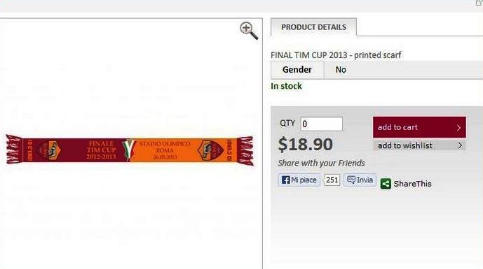 Non si fermano le delusioni per i tifosi giallorossi dopo la sconfitta nel derby contro la Lazio valevole per la conquista della Coppa Italia. Se il tifoso romanista infatti sta cercando di metabolizzare e per quanto possibile cancellare l’onta di una sconfitta gravissima come quella del 26 maggio, un aiuto di certo non arriva dalla società. La stessa infatti (notizie di ieri), ha messo in commercio una “sciarpa commemorativa” (26/05/ 2013, io c’ero), a quanto pare già prontamente tolta dal mercato in seguito alle molte mail di protesta da parte dei supporters giallorossi.