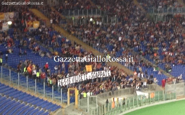 COPPA ITALIA – Mancano sei giorni alla finale di Coppa Italia contro la Lazio e la tensione in casa giallorossa comincia a farsi sentire. Ieri sera, durante la partita contro il Napoli, i tifosi della Roma hanno srotolato diversi striscioni per far capire alla squadra quanto tengano alla sfida contro la Lazio. Il più eloquente quello sposto dai ragazzi della curva Nord che recitava: “26-5-13 Vincete o scappate”.