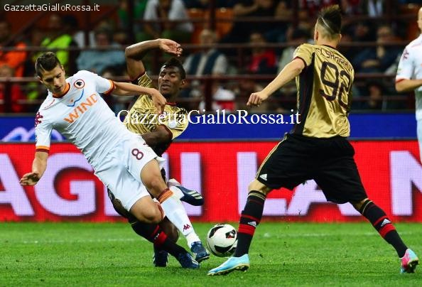Andreazzoli risponde con un trio d’attacco formato da Lamela, Totti e Osvaldo. I rossoneri sembrano avvertire la tensione tipica della gara decisiva per l’accesso alla Champions League. La partita è vibrante, nervosa. Anche un trascinatore come Balotelli fatica ad uscire dalla morsa dei centrali giallorossi, mentre Abbiati è costretto a scaldare i guantoni già al 4′ su una bordata di Marquinho. Il brasiliano colleziona tre occasioni da rete in 25′ ma trova sempre il portiere avversario sulla propria strada. Nel Milan il più pericoloso è Boateng che ha l’opportunità più ghiotta del primo tempo: cross basso di De Sciglio dalla destra per il ghanese la cui deviazione da pochi passi finisce addoso a Lobont. I giallorossi ci provano spesso da fuori area, soprattutto con Totti. Sale la tensione in campo quando i tifosi della Roma intonano ululati razzisti contro Balotelli che reagisce portandosi un dito alla bocca per zittirli. I cori continuano fino a quando lo speaker di San Siro ricorda che la partita potrebbe anche essere sospesa. L’attaccante confeziona due occasioni da gol ma si fa ammonire da Rocchi per un fallo nella trequarti avversaria. La situazione degenera con Muntari che protesta in maniera eccessiva verso il direttore di gara, prendendolo per un braccio e lasciandosi andare ad un commento evidentemente sopra le righe.