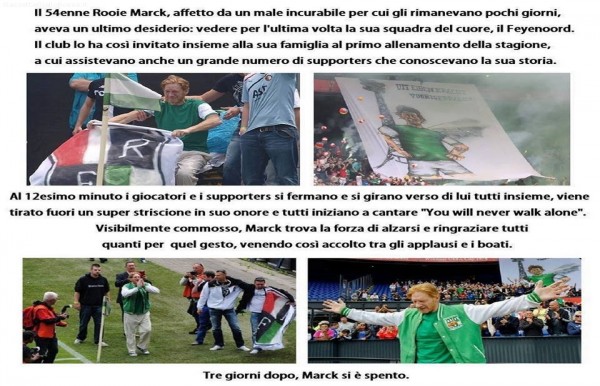 Storia da libro cuore in Olanda. Un tifoso del Feyenoord, Rooie Marck, malato da diverso tempo e’ riuscito a realizzare il suo sogno prima di morire:  “vedere il Feyenoord” dal vivo”.