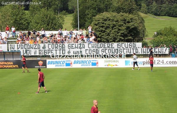 Primo giorno di Ritiro della nuova Roma di Rudi Garcia sotto un sole estivo a Riscone di Brunico. Circa 300 i tifosi giallorossi presenti. Esposto uno striscione che recitava: