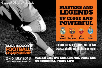 SOCIAL NETWORK Anche la Roma al Dubai Indoor Football Archivio by - 2 Luglio 2013 Dubai Indoor Football Come riportato sul profilo ufficiale dell’As Roma, anche una rappresentanza di ex giallorossi è presente al Dubai Indoor Football Championship. Sul profilo ufficiale è possibile vedere le foto degli ex giocatori della Roma presenti. Fonte: Twitter