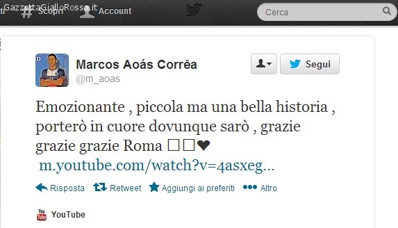 SOCIAL NETWORK Marquinhos: “Roma esperienza breve ma bella” Archivio PRIMO PIANO RUBRICHE by - 27 Luglio 2013 Tweet Marquinhos L’ex giallorosso Marquinhos, ora in forza al PSG, ha dedicato un “cinguettio” all’As Roma: “Una emozionante, breve ma bella esperienza, che porterò nel mio cuore dovunque sarò. Grazie, grazie, grazie Roma”