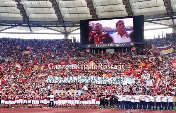 STRISCIONI – Immancabili. Tanti e variegati. Che toccano concetti diversi. Lo striscione più significativo è bello grande, leggibile da ogni angolazione. Viene esposto in Curva Sud prima dell’abbraccio della squadra: “Non sapere rimediare alla sconfitta è peggiore della sconfitta stessa”. All’inizio ne compare uno piccolo piccolo come la speranza di vederlo ancora con la maglia della Roma: “Lamela non si tocca”. Non mancano le scritte goliardiche: “17-08-2013: disinfettate Trigoria”. Parole e numeri riferiti all’allenamento della Juve, sostenuto nel quartier generale giallorosso prima della Supercoppa vinta contro la Lazio. (…)