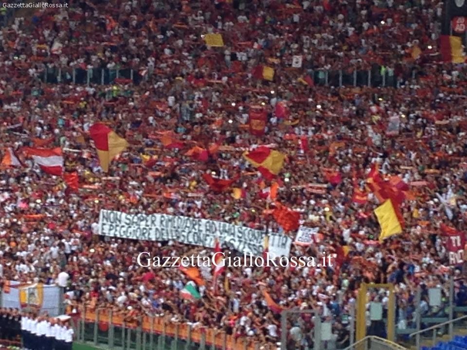 LA CONTESTAZIONE Del resto, in precedenza i fischi erano già arrivati sonori per Andreazzoli, Lobont e Balzaretti, miscelati agli applausi surreali a Julio Sergio (separato in casa) e quelli molto più veri per i nuovi acquisti (fortissimi quelli per De Sanctis e Maicon) e per gli idoli di casa: De Rossi, Florenzi e ovviamente Francesco Totti. «Non saper rimediare ad una sconfitta è peggiore della sconfitta stessa» è lo striscione con cui la curva Sud ha accolto la squadra. E poi gli altri, uno dietro l’altro: «26-5: non dimentichiamo, vergogna», «No al nuovo stemma» e «17-08-13: disinfettate Trigoria», riferito all’ospitalità offerta dalla Roma alla Juventus prima della Supercoppa italiana. Insomma, un clima di contestazione atteso, che pian piano si è sciolto quando poi la squadra ha cominciato l’allenamento.
