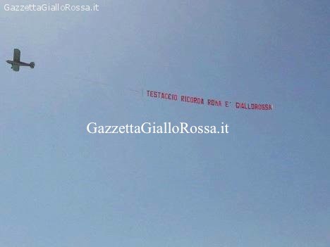 E’ arrivata la risposta del popolo romanista agli striscioni sfottò organizzati dai tifosi laziali dopo il 26 maggio. Oggi sulle spiagge del litorale romano, da Fregene a Ostia, è volato un aeroplano, con tanto di striscione attaccato alla coda, con scritto: “Testaccio ricorda: Roma è giallorossa”.