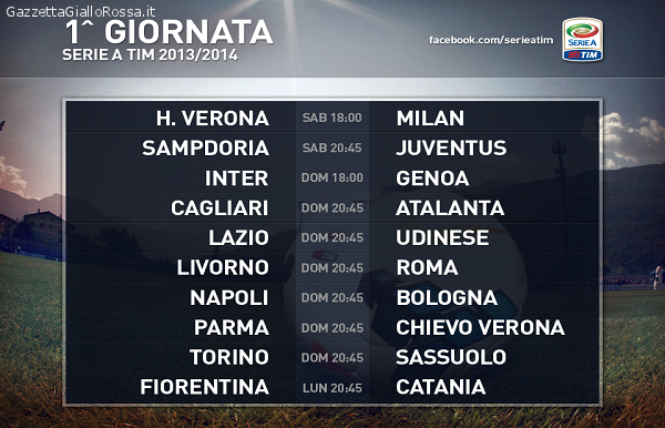 Alle 20.45 a Genova in campo Sampdoria e Juventus. Domani alle 18.00 a San Siro Inter-Genoa. Alle 20.45 Lazio-Udinese, Livorno-Roma, Napoli-Bologna, Parma-Chievo, Torino-Sassuolo. Chiude la prima giornata Lunedi alle 20.45 Fiorentina-Catania