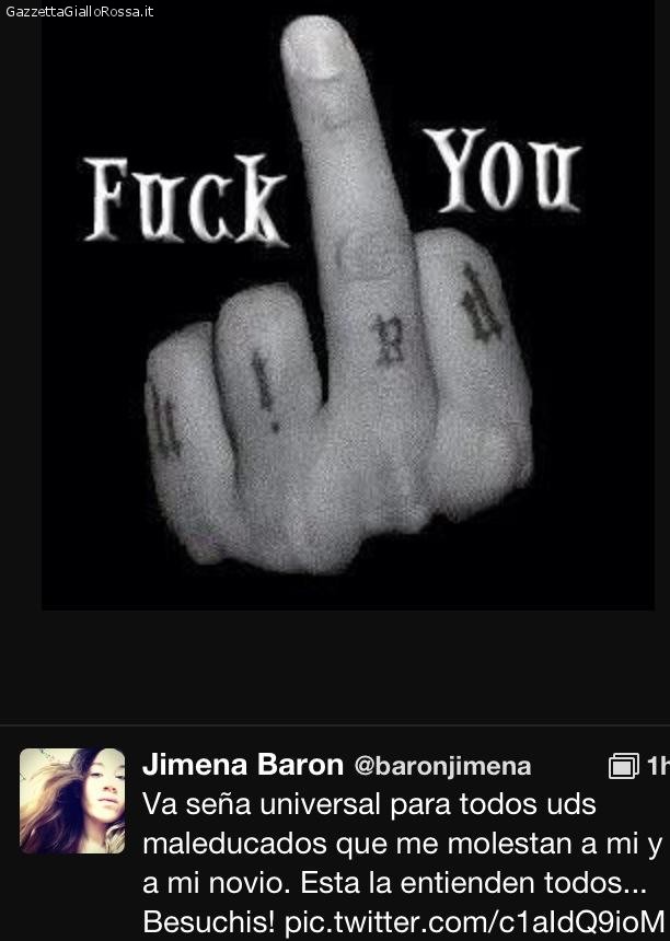A breve giro di posta un nuovo Tweet di Jimena dove e’ anche allegata la foto di una mano che mostra il terzo dito:
