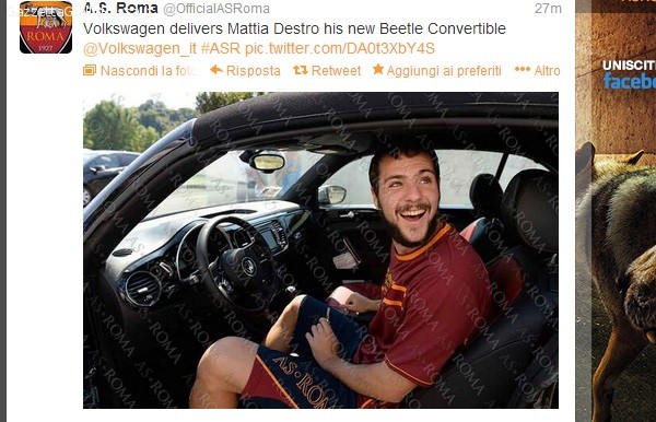 SOCIAL NETWORK La Volkswagen consegna a Destro un maggiolino Archivio RUBRICHE by - 20 Agosto 2013 Consegnato un Maggiolino a Destro Nella giornata di oggi Mattia Destro è stato omaggiato dalla Volkswagen di un maggiolino cabrio
