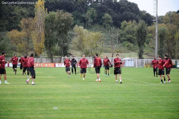 Ore 9:40 Comincia la seduta con una corsetta per i giallorossi. Assenti Destro e Strootman.