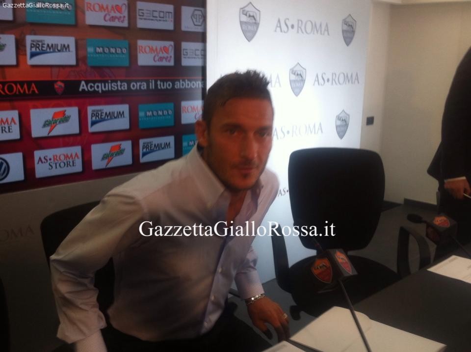 Il capitano giallorosso firma il rinnovo fino al 2016 davanti al presidente Pallotta: «Orgoglioso di poter vestire ancora per due anni la maglia che amo. Mi spiace per Moratti. Del Piero? La Juve non lo ha rispettato come la Roma ha fatto con me. La foto più bella? Quella del gol scudetto. Ai Mondiali non penso, la mia Nazionale è la Roma». Pallotta: «Mai avuto dubbi sulla permanenza di Francesco. Lui resterà qui per sempre. In questi ultimi quattro mesi fatti notevoli progressi»