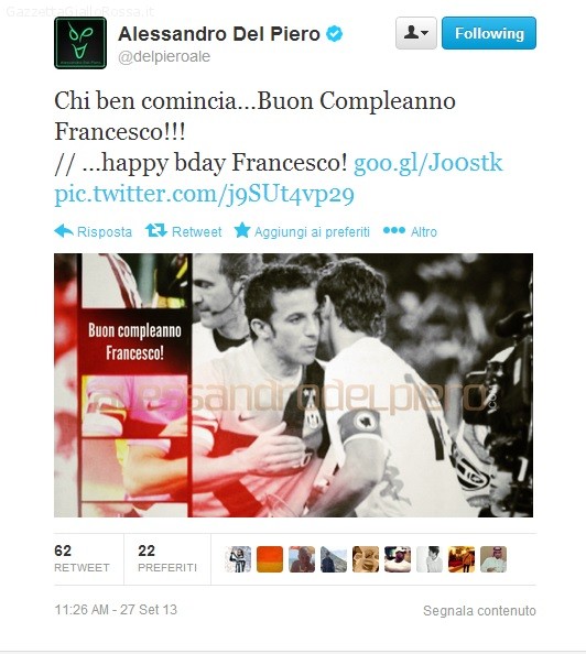 Auguri da capitano a capitano. Alessandro Del Piero festeggia Francesco Totti con un messaggio su twitter. L’ex giocatore della Juve si congratula con il n° 10 giallorosso per aver raggiunto le 37 primavere: “Chi ben comincia…Buon Compleanno Francesco!!!// …happy bday Francesco!”.