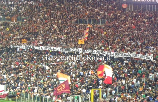Nel corso del primo tempo di Roma Napoli in Curva Sud sono stati esposti i seguenti striscioni