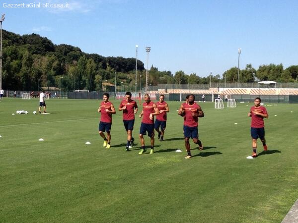 Ore 10:55 Riscaldamento con palleggi. Lo staff di Rudi Garcia illustra il lavoro della giornata. In campo i recuperati Maicon e Bradley. Presenti anche Francesco Totti, De Rossi e Benatia. Gervinho impegnato in palestra per lavoro defaticante.
