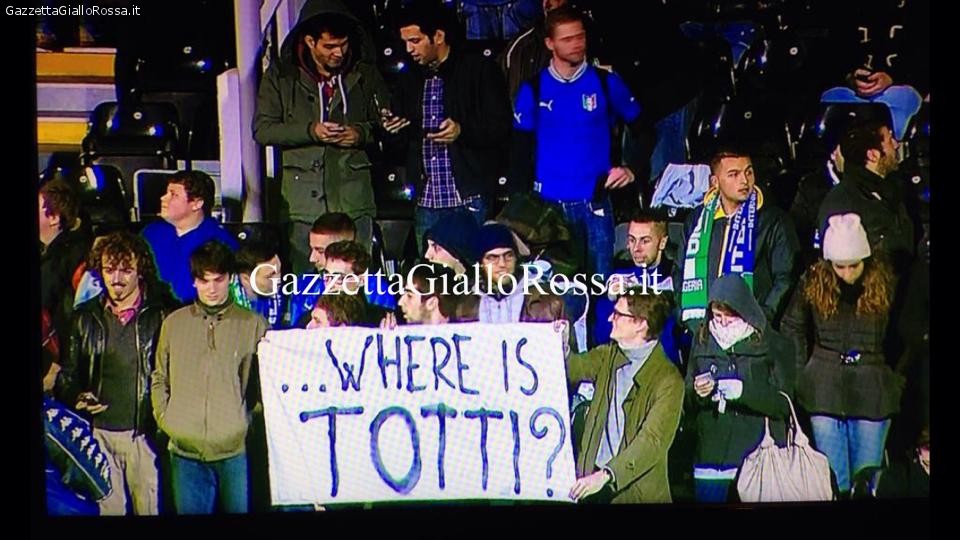 La stima e l’ammirazione per Francesco Totti non si fermano neanche Oltremanica. Al Craven Cottage di Londra, prima della sfida amichevole tra Italia e Nigeria, alcuni tifosi presenti sugli spalti hanno esposto uno striscione, rivolto molto probabilmente al ct Cesare Prandelli, che recita: “Where is Totti?”.