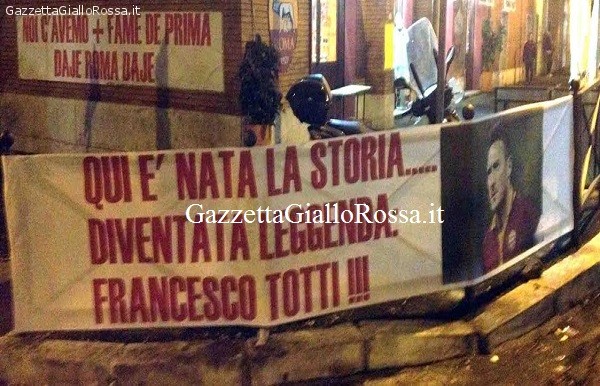 GAZZETTA GIALLOROSSA Esposto striscione per Totti a via Vetulonia (FOTO) PRIMO PIANO by - 21 Dicembre 2013 Nel pomeriggio di oggi è stato esposto in via Vetulonia uno striscione per Francesco Totti con scritto QUI E’ NATA LA STORIA… DIVENTATA LEGENDA: “FRANCESCO TOTTI!!!” Striscione