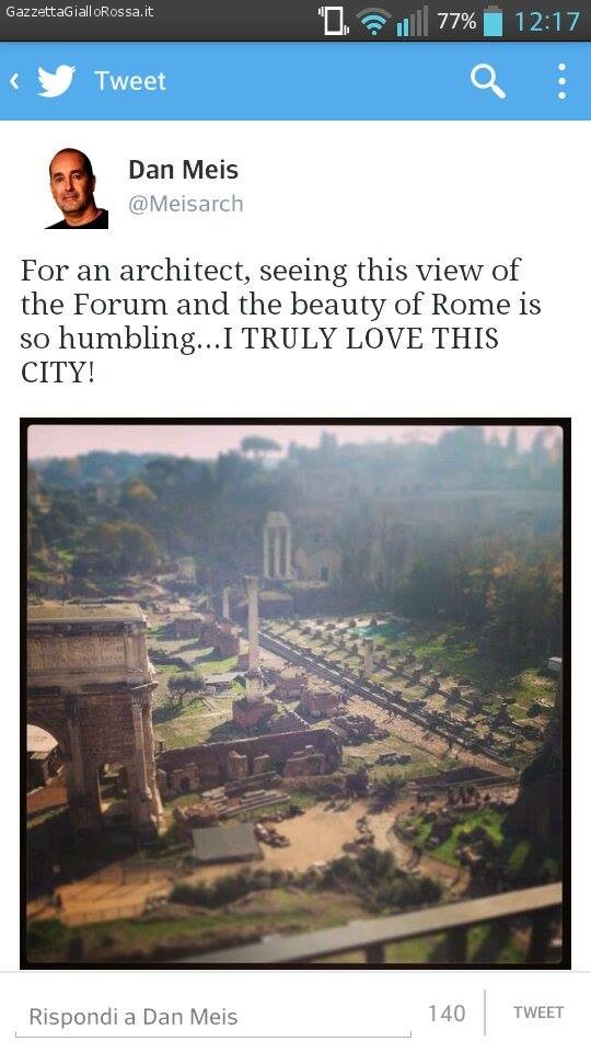 STADIO AS ROMA Dan Meis: “Io amo questa città” Archivio PRIMO PIANO by - 9 Dicembre 2013 L’architetto che realizzerà lo stadio dell’As Roma presente oggi in Campidoglio ha pubblicato il seguente tweet Tweet Dan Meis