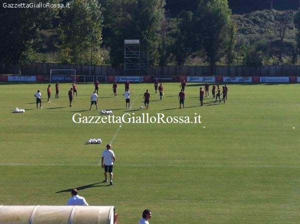 Ore 15:10 La squadra si sta allenando sul campo B dove sta effettuando il riscaldamento. Assenti De Rossi, Totti, Destro e Balzaretti. Torosidis in gruppo.