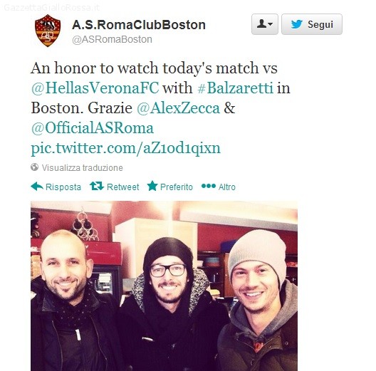 AS ROMA Balzaretti al R.C.Boston con Alex Zecca Archivio PRIMO PIANO by - 26 Gennaio 2014 Federico Balzaretti ha seguito l’incontro tra Verona e Roma al Roma Club di Boston in compagni del dirigente Raptor Alex Zecca Balzaretti