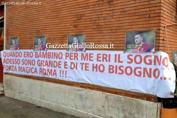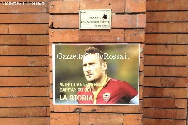 Ennesimo omaggio al capitano Francesco Totti. In città è comparso uno striscione con scritto: “Quando eri bambino per me eri il sogno…ora sono grande e di te ho bisogno…Forza Magica Roma!!!”. Lo striscione è corredato da varie foto di Totti che recitano: “Altro che leggenda Capità, tu sei la storia”, ed inoltre la zona dove è stato collocato lo striscione è stata intitolata: “Piazza Francesco Totti”, con tanto di targa.