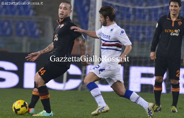 toro-gol — Garcia lancia subito Nainggolan, il guerriero sbarcato nella Capitale solo martedì scorso ed in campo dal primo minuto come intermedio sinistro. Il ninja giocherà una partita ad intermittenza, ma quantomeno si è dimostrato un bel portafortuna, visto che dopo 6′ la Roma è già avanti: cross di Dodò, Fiorillo cincischia sul tocco ravvicinato di Destro e Torosidis sul secondo palo mette dentro. Allora la Samp (che manca di Eder, Gabbiandini, De Silvestri, Palombo e Krsticic) è costretta a cambiare volto, alza il baricentro del pressing per togliere fiato alle idee giallorosse, con Wszolek che mette subito paura a Skorupski con un buon spunto in velocità. Ma il motore blucerchiato va a giri ridotti e la Roma, seppur senza dannarsi, controlla la partita senza affanni. E sulle ripartenze Ljajic prima non riesce a servire Destro da solo in mezzo all’area, poi (25′) offre proprio a Nainggolan un pallone tanto delizioso quanto facile da insaccare, ma il ninja spreca tutto con un piattone su Fiorillo. Ed allora al 30′ Ljajic ci prova lui, su imbeccata di Florenzi, ma il portiere della Samp è bravo a salvare in angolo. Al 36′ Roma ad un soffio da raddoppio, con Fiorillo che prima para il sinistro ravvicinato di Florenzi e poi è strepitoso nel dire ancora no con un colpo di reni sulla ribattuta dell’attaccante giallorosso.