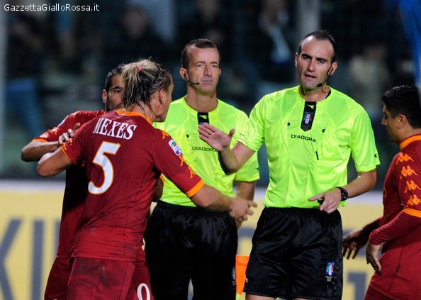 PRECEDENTI CON LA ROMA – Secondo incrocio stagionale per i giallorossi con il direttore di gara originario di Avellino. Il nome di Russo non evoca mai grandi sensazioni nell’ambiente giallorosso , in quanto al di la delle 7 affermazioni in 9 gare,(8 in campionato ed una in Coppa Italia) resta indelebile nella mente del popolo di fede romanista quella, a dir poco sciagurata serata di Brescia, quando il fischietto di Nola ne combinò di tutti i colori, condizionando in maniera piuttosto marcata il corso della gara: il fatto più evidente fu senza dubbio la concessione di un penalty inesistente, che comportò l’espulsione di Mexes per fallo da ultimo uomo su Eder, mentre il francese aveva compiuto un intervento da annoverare tra i più belli e puliti della sua carriera affondando il tackle nettamente sul pallone. Gara poi persa per 2-1 , con Julio Sergio rimasto in campo tra le lacrime per un infortunio occorsogli alla caviglia nel finale – quando Ranieri aveva esaurito i cambi a disposizione – per tamponare l’inferiorità numerica. Altra sanguinolenta sconfitta fu quella interna nella gara contro il Livorno per 1-0: decisiva una rete di Tavano sotto la Sud, nella più classica riproposizione del gol dell’ex. Sotto la sua direzione la Roma è stata sanzionata con 13 cartellini gialli, da cui un’espulsione per somma di gialli e 3 rossi diretti, precisamente quelli ricevuti da De Rossi e Perrotta nella sfida contro il Bari che si sommano all’espulsione per somma di cartellini inflitta a Mexes e quella per rosso diretto mostrata in Coppa Italia ad Osvaldo , reo di aver rifilato una gomitata al volto del difensore atalantino Mathieu. Gli avversari di turno dei giallorossi hanno ricevuto 19 ammonizioni, con annesse 2 espulsioni, delle quali una per rosso diretto. Sul fronte rigori, nonostante gli sciagurati trascorsi, la squadra capitolina ha potuto usufruire di 4 penalty in favore, mentre sono 2 i tiri dal dischetto assegnati contro. Il precedente più recente risale alla gara del girone di andata contro il Bologna vinta prepotentemente dai giallorossi per 5-0