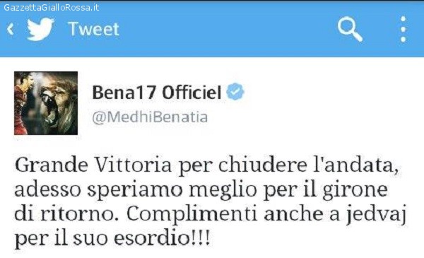 Il capocannoniere giallorosso Benatia tramite twitter si complimenta con Jedvaj per l’esordio e con tutta la squadra per lo splendido girone d’andata