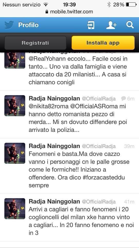 SOCIAL NETWORK Nainggolan insultato e aggredito all’aeroporto di Cagliari Archivio PRIMO PIANO by - 26 Gennaio 2014 Il centrocampista giallorosso Radja Nainggolan è stato insultato da circa 20 tifosi del Milan presenti all’aeroporto di Cagliari. Tweet Nainggolan