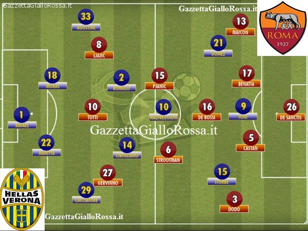 VERONA (4-3-3): 1 Rafael, 23 Gonzalez, 18 Moras 22 Maietta 33 Agostini 2 Romulo 14 Cirigliano 10 Hallfredsson 15 Iturbe 9 Toni 21 Gomez. All. Mandolini