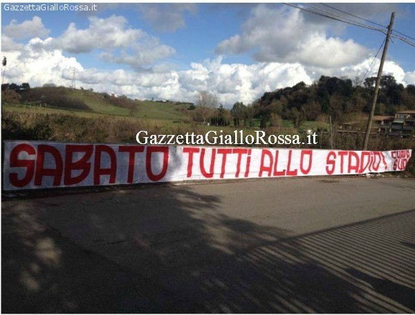 La decisione del giudice sportivo di chiudere Curve e Distinti Sud per il match contro l’Inter di sabato non ha lasciato i tifosi indifferenti. E mentre sabato è prevista una manifestazione di protesta sotto gli uffici della FIGC oggi a Trigoria è stato appeso uno striscione con scritto: “Sabato tutti allo stadio”. L’appuntamento per i tifosi è sotto l’obelisco all’esterno della Curva Sud nelle ore precedenti alla gara contro i nerazzurri.