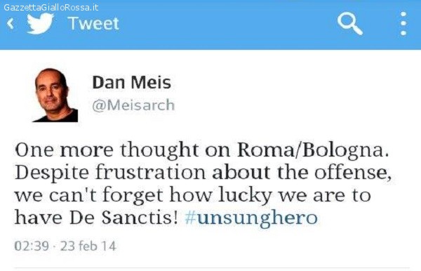 AS ROMA Dan Meis: “Siamo fortunati ad avere De Sanctis” Archivio PRIMO PIANO by - 23 Febbraio 2014 Dan Meis, l’architetto che progetterà il nuovo stadio dell’As Roma, su Twitter ha espresso la sua delusione per la poca incisività dell’attacco giallorosso ed ha elogiato il carattere di Morgan De Sanctis