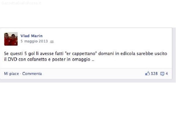 L’ultimo colpo di Walter Sabatini è stato quello del giovane rumeno Marin, terzino in forza al Manchester City ed ex giocatore del settore giovanile laziale. Nulla di grave  in relazione al suo passato in biancoceleste ma è da considerare “molto grave” la gestione dei social network di Marin. Nell’era di Facebook e Twitter usati da politici, personaggi pubblici ed uffici stampa per diramare comunicazioni ufficiali non si può tollerare il comportamento del giovane Marin. Per rendere l’idea pubblichiamo di seguito lo screen del profilo facebook del giovane rumeno relativo allo stato ( prontamente cancellato) dove sbeffeggia capitan Totti ed i tifosi giallorossi