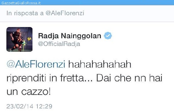 SOCIAL NETWORK Nainggolan risponde a Florenzi Senza categoria by - 23 Febbraio 2014 Radja Nainggolan risponde tramite twitter ad Alessandro Florenzi mettendo in evidenza lo splendido clima presente nel gruppo dei giocatori giallorossi