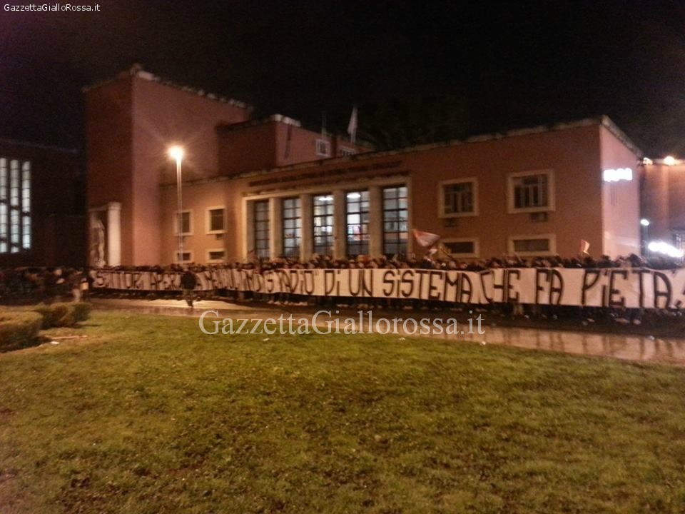 (G. Piacentini) – È stata una partita doppia, quella vissuta ieri sera dai tifosi della Roma. In ventimila, sistemati nelle due tribune e nel settore famiglia, hanno tifato dentro lo stadio (incassando anche la solidarietà dei circa trecento interisti che occupavano il settore ospiti) mentre circa un migliaio, gli «squalificati», lo hanno fatto nei dintorni dell’Olimpico. Sono stati loro a dare il segnale più forte, radunandosi davanti alle piscine dello stadio del nuoto, circa un’ora prima del fischio d’inizio.«Settori chiusi a metà, l’ultimi stadio di un sistema che fa pietà», lo striscione che ha fatto da apripista alla manifestazione di protesta itinerante (i tifosi sono partiti dal lungotevere e hanno fatto il giro dello stadio) che è andata avanti per tutto il primo tempo sotto lo sguardo delle forze dell’ordine.