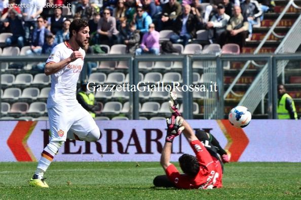 Vivacità sotto un sole di convinta primavera, il Sassuolo è frizzante al punto tale da prestare spesso il fianco: meglio quando offendono di quando gestiscono, gli uomini di Eusebio Di Francesco. Forse non è un caso che il vantaggio giallorosso arrivi grazie a un pallone che Nainggolan ruba nella trequarti come fosse la caramella di un pupetto; palla a Destro nel corridoio e “scavetto” ai danni di Pegolo in uscita: lo zero a uno è una carezza dai giri contati, l’urlo del settore ospiti scuote il sud della Padania.