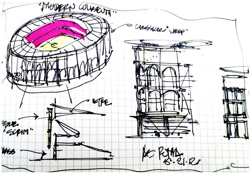 Giornata epocale per i colori giallorossi quella che si è consumata alle ore 11 nella sala Protomoteca Campidoglio. Davanti ad un pubblico di eccezione, il presidente James Pallotta coadiuvato dall’architetto Dan Meis, alla presenza della commissione direttiva capitolina e dell’amministrazione comunale, ha tolto il sipario al nuovo stadio deputato ad ospitare in futuro le gare interne della Roma. Presenti all’evento alcuni illustri esponenti del passato sportivo romanista come Falcao e lo stesso Bruno Conti oltre ai riferimenti del presente Totti, De Rossi, Rudi Garcia e l’intera squadra reduce dal successo sul Torino. Queste alcune immagini inedite della prossima casa giallorossa, dalle bozze del progetto fino al prospetto grafico.